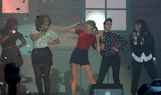 La interprete de "We're never ever ever ever ever getting back together" lucio un vestido de Kaufman Franco, unas zapatillas Christian Louboutin, aretes de la firma Ofina, un anillo de Lorraine Schwartz. Su presentación fue un tanto rapida pero complacio a los asistentes, interpretando "Love Story" y su sencillo "We're never ever ever ever... getting back together", luciendo su caracteristico short negro y blusa roja.